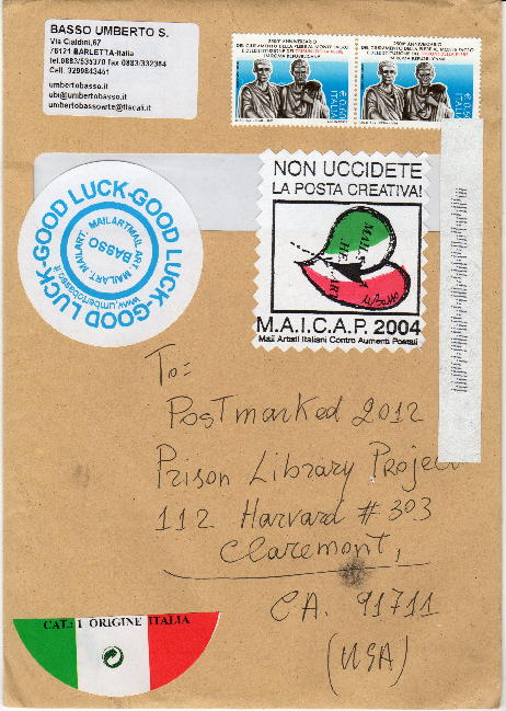 Watch this blog for new art submissions and don't forget to create your own mail art. Mail artwork to Postmarked 2012, Prison Library Project, 112 Harvard #303, Claremont, CA 91711.